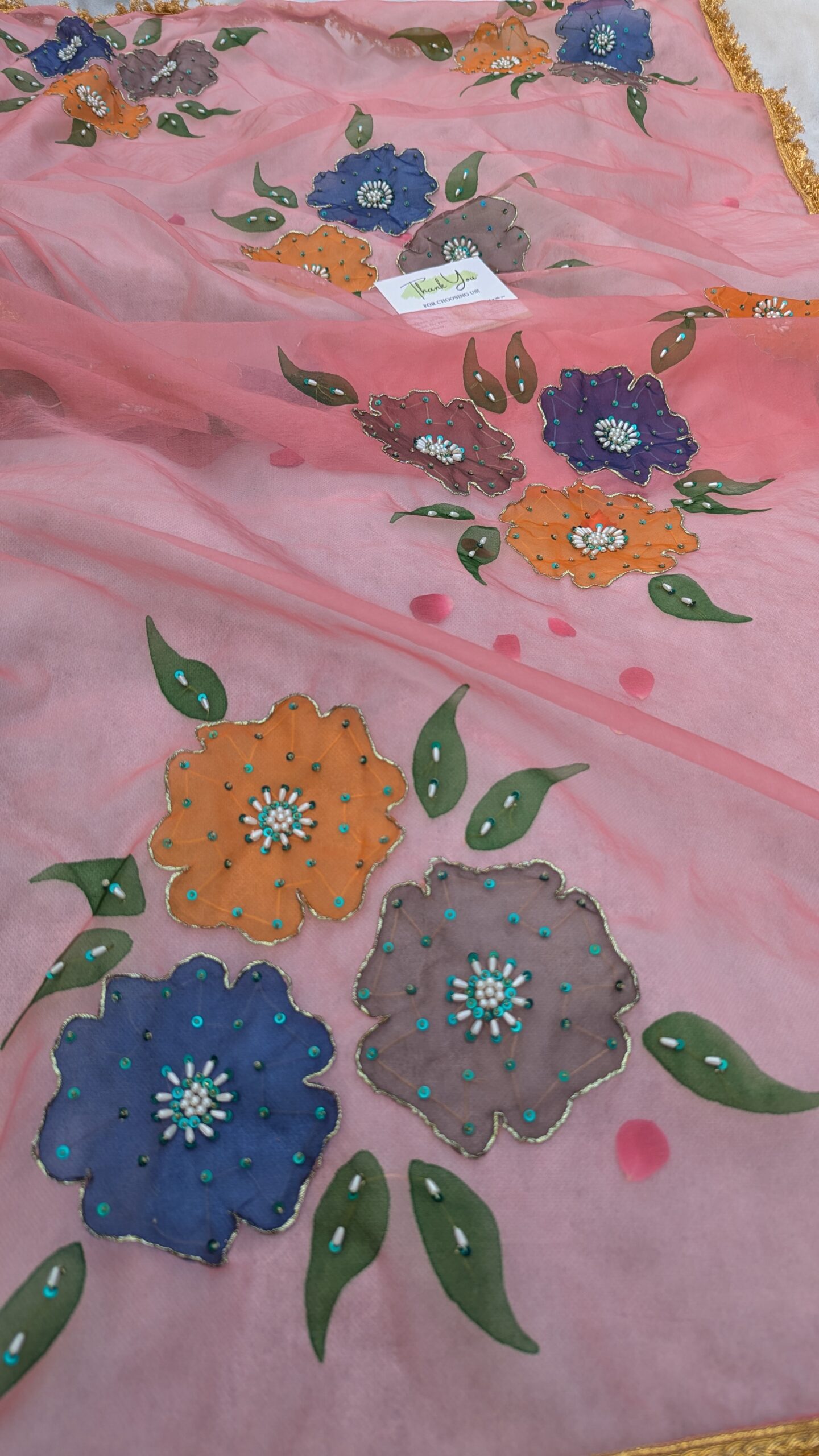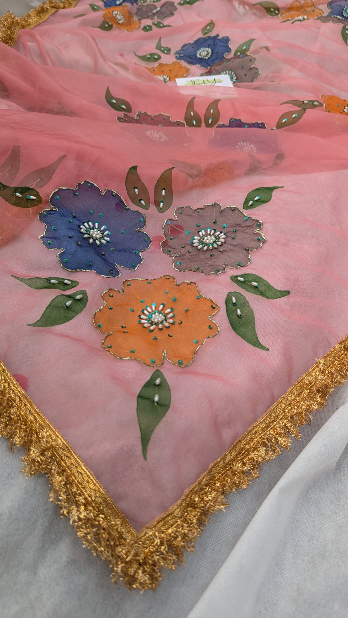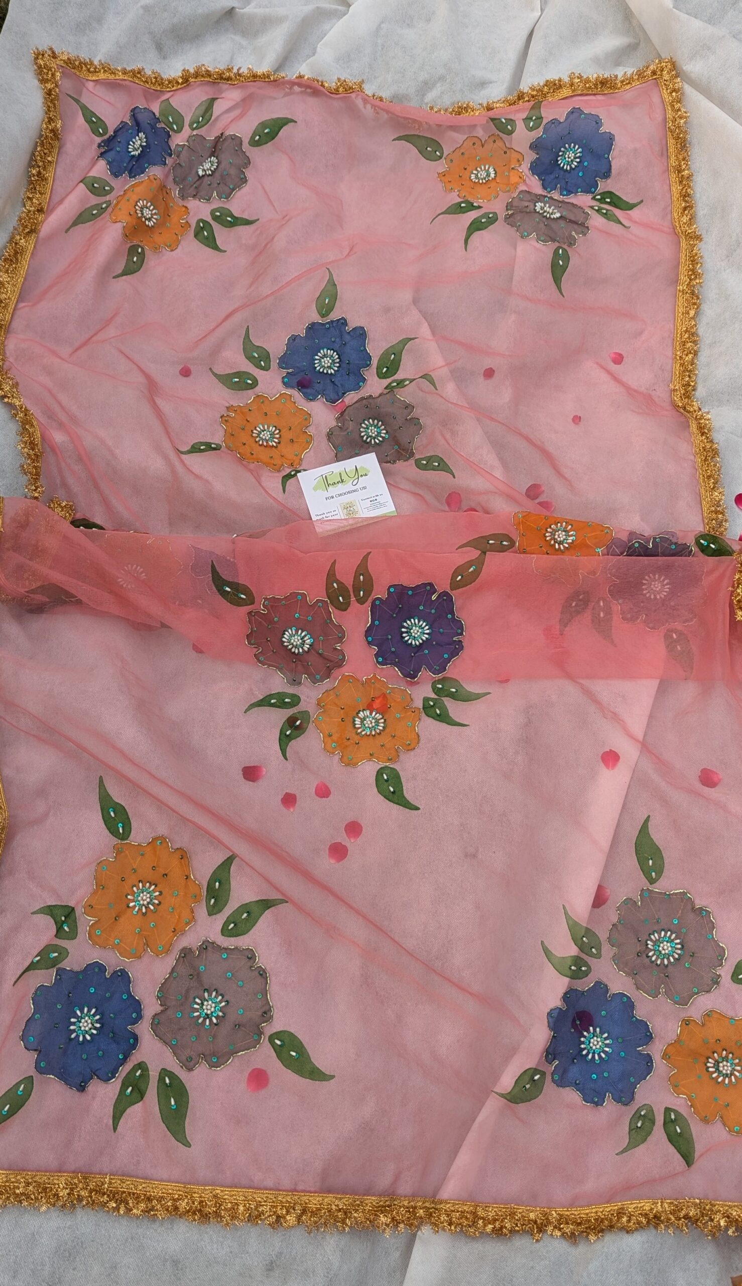 Elevate your wardrobe with this hand-painted pure organza dupatta, blending timeless artistry with traditional embellishments.