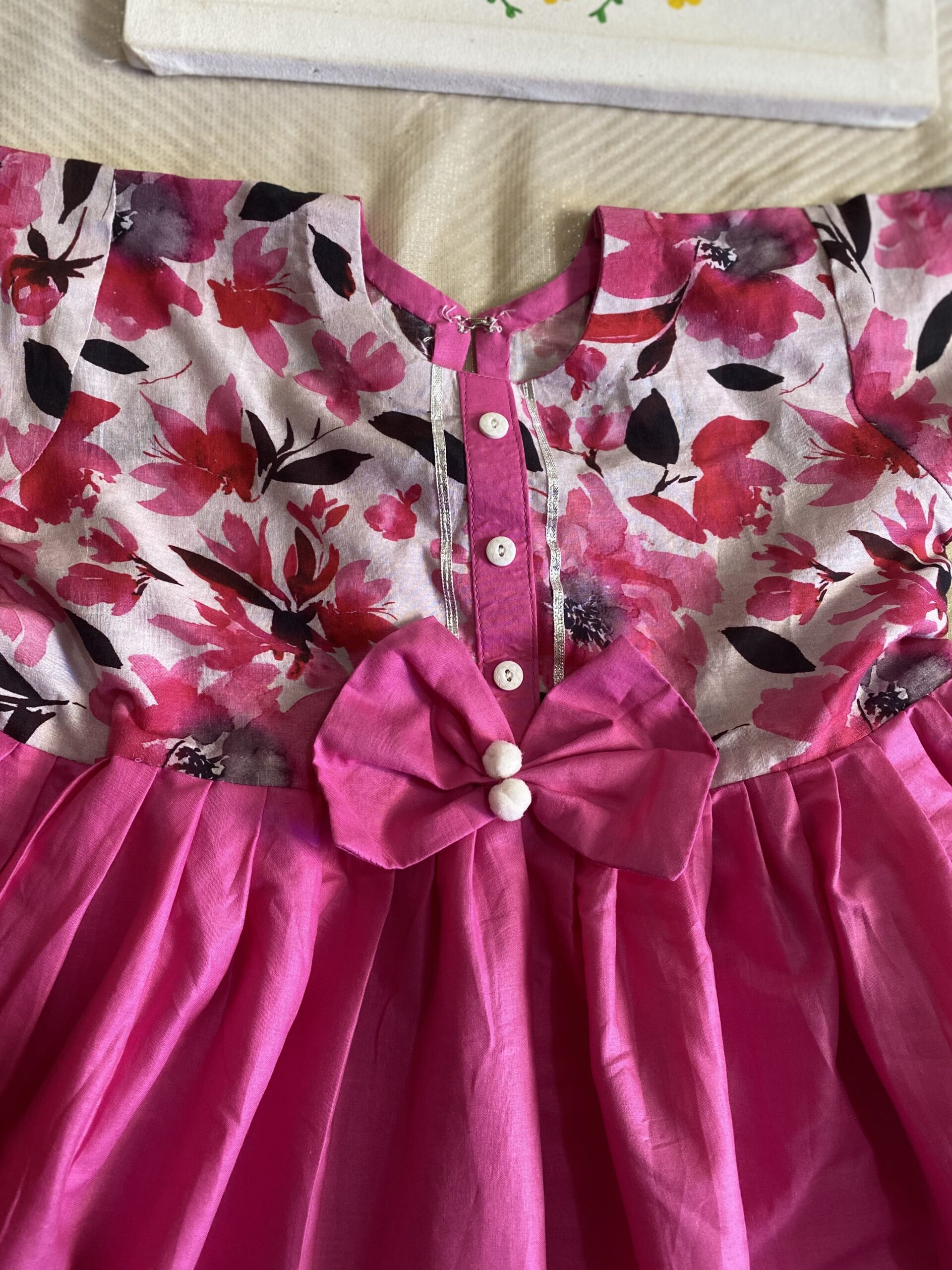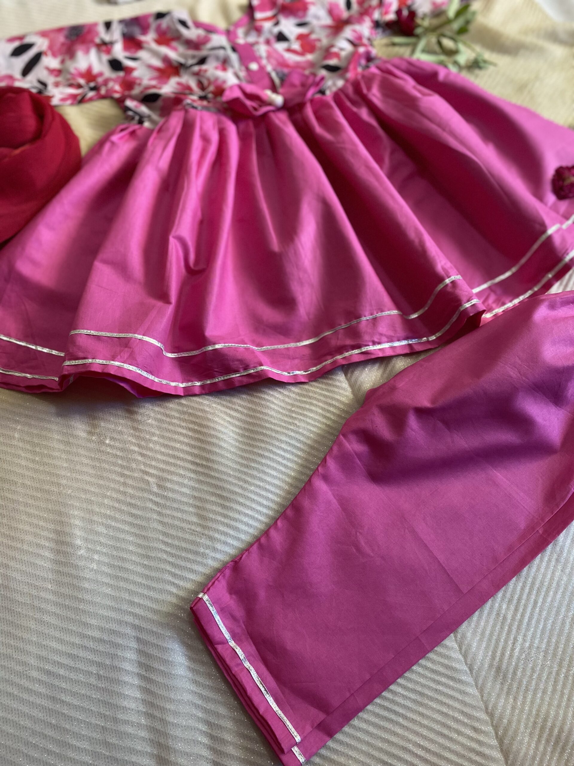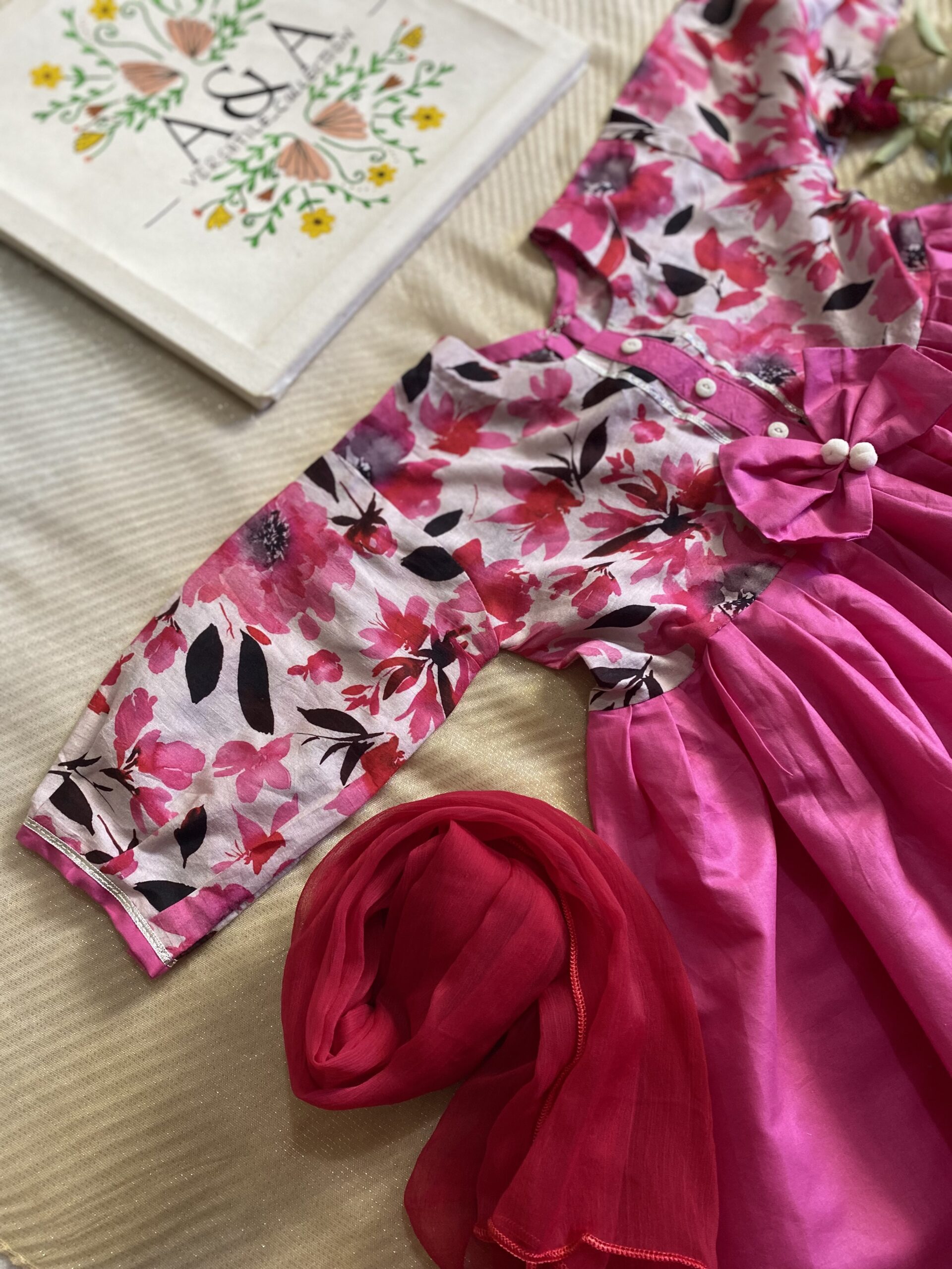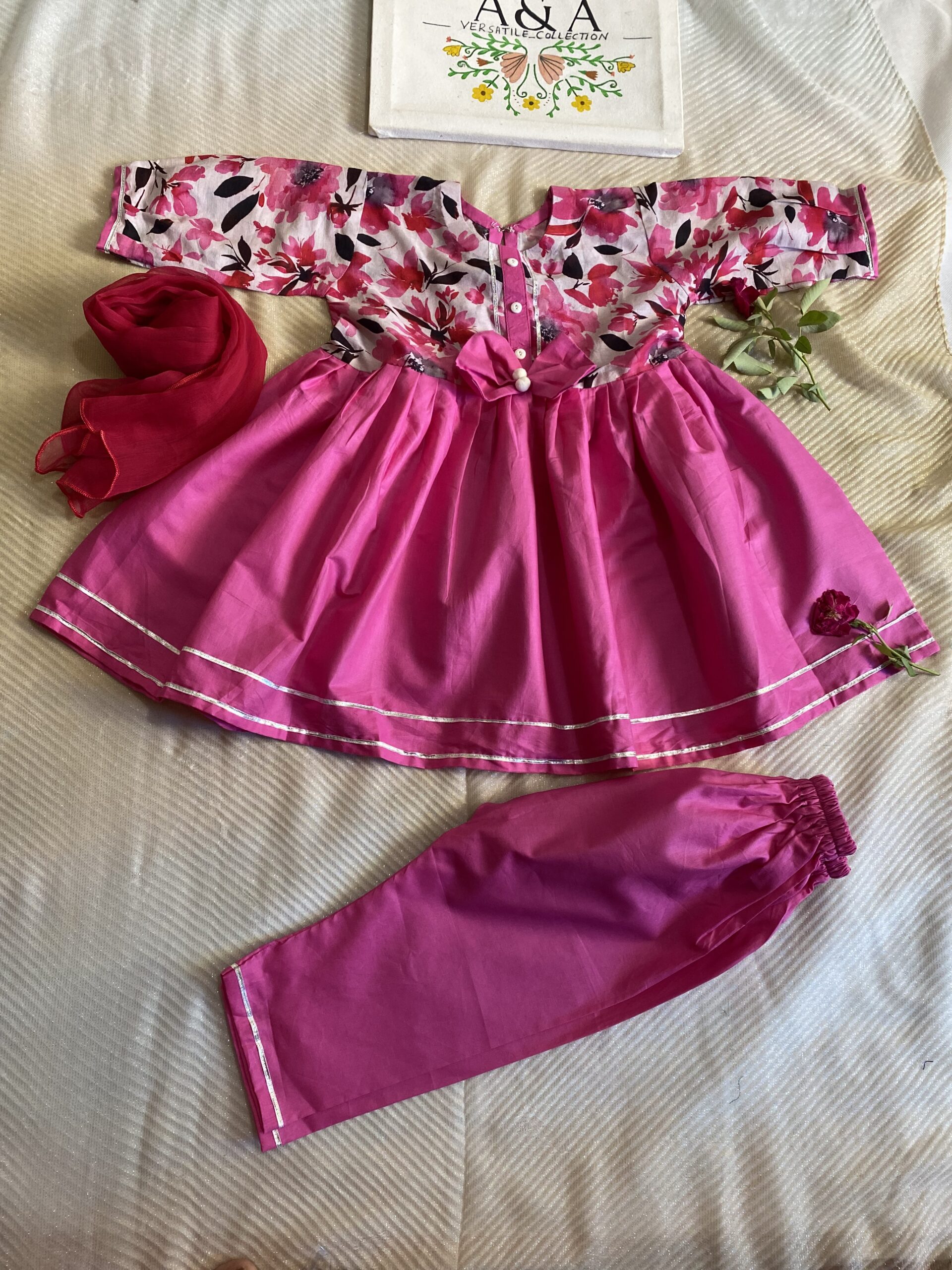 A stunning 3-piece stitched lawn outfit for kids aged 3-4 years, featuring a frock-style pink shirt with a floral printed bodice and elegant bow detail, paired with a matching trouser and a soft chiffon dupatta. Designed for a stylish yet comfortable summer look.