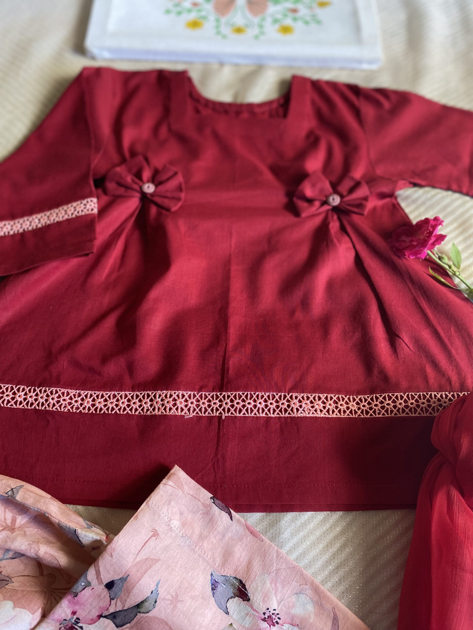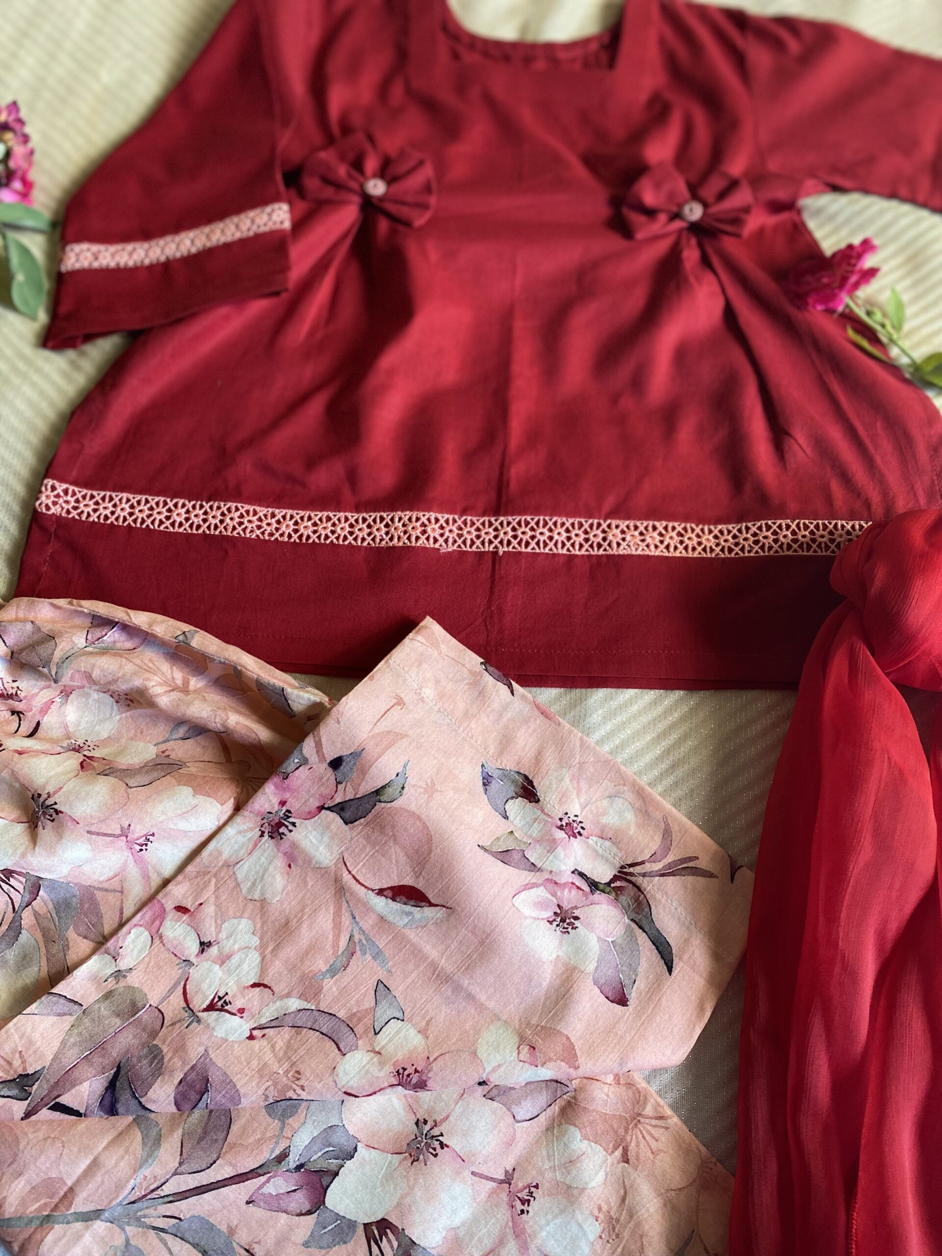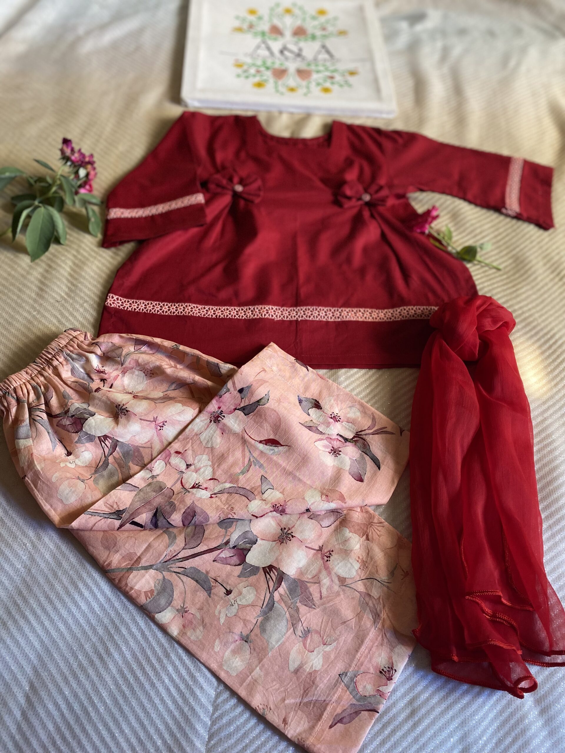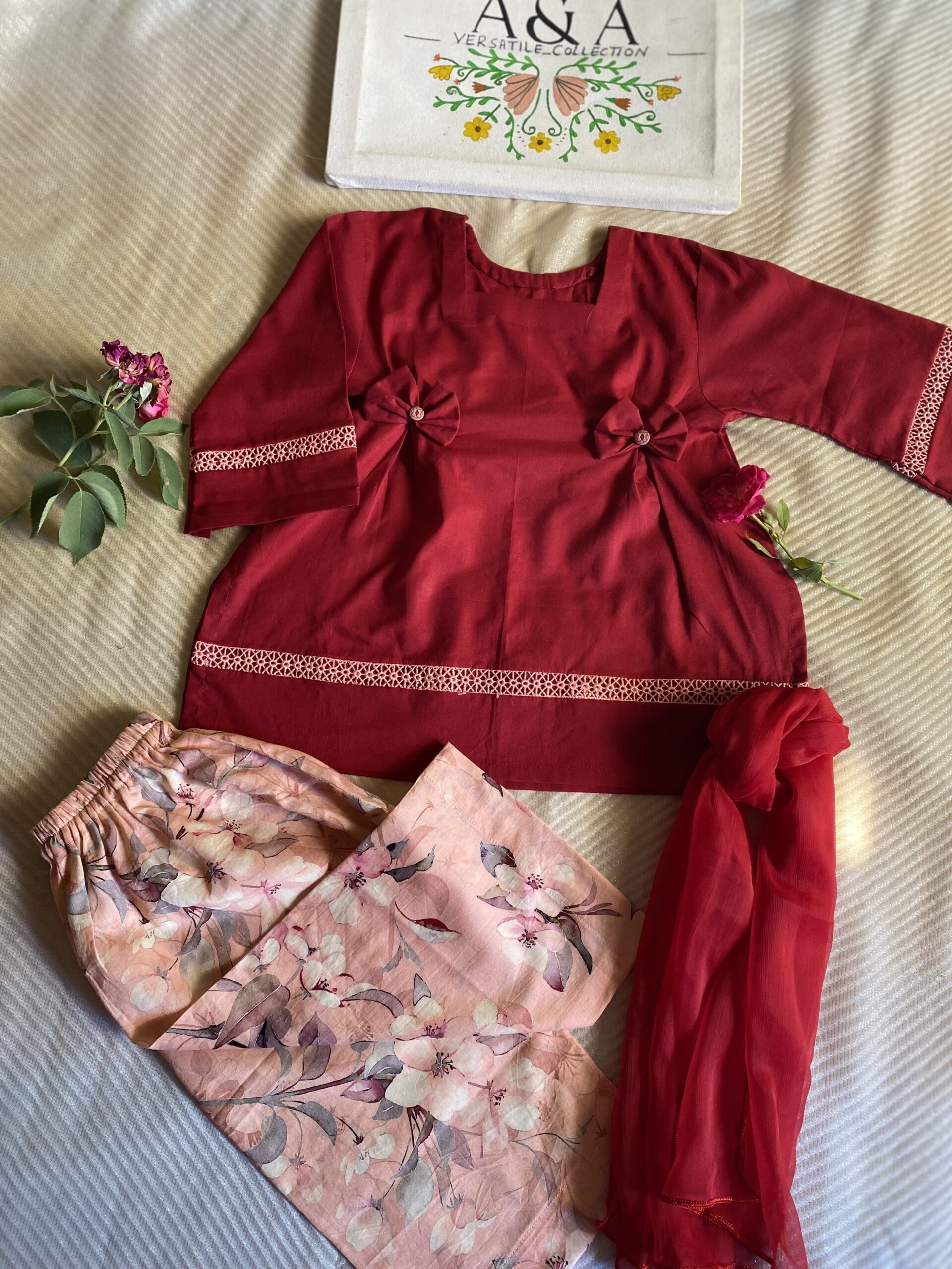 A chic 3-piece stitched lawn outfit featuring a solid maroon shirt, a peach printed trouser, and a soft lightweight dupatta. Designed for elegance and comfort, this stylish set is a perfect summer wardrobe essential for your little one.