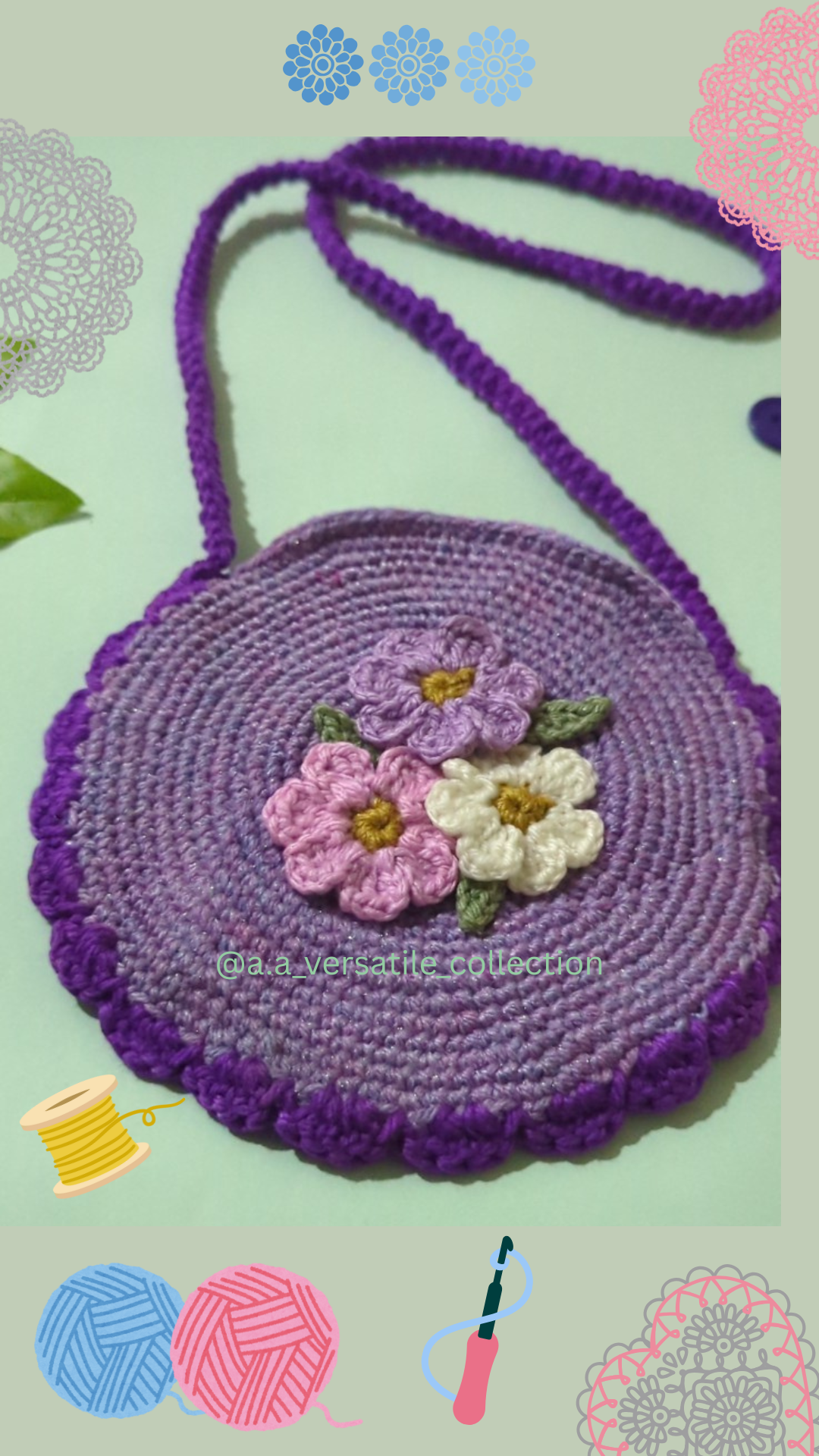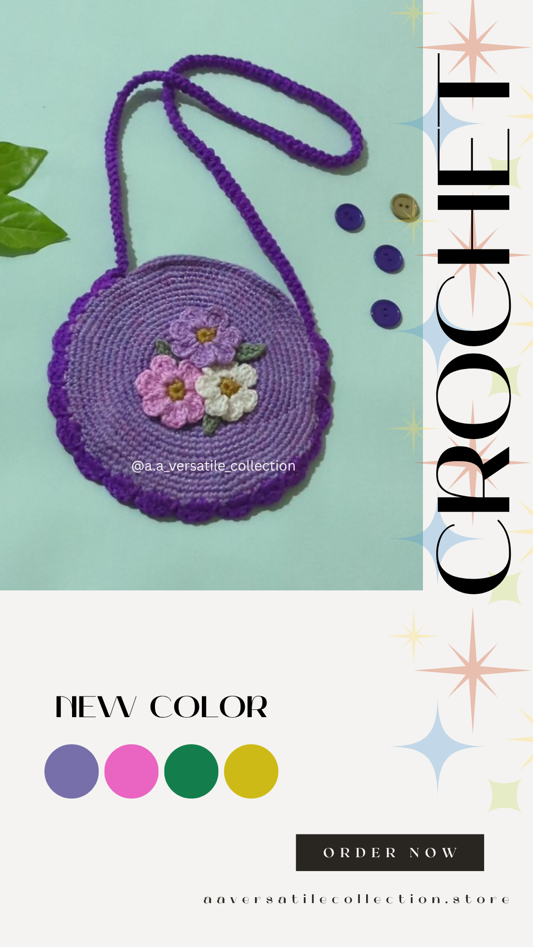 Elegant round crochet bag in purple with 3D floral embroidery. A lightweight & trendy crossbody, perfect for casual outings & gifting.